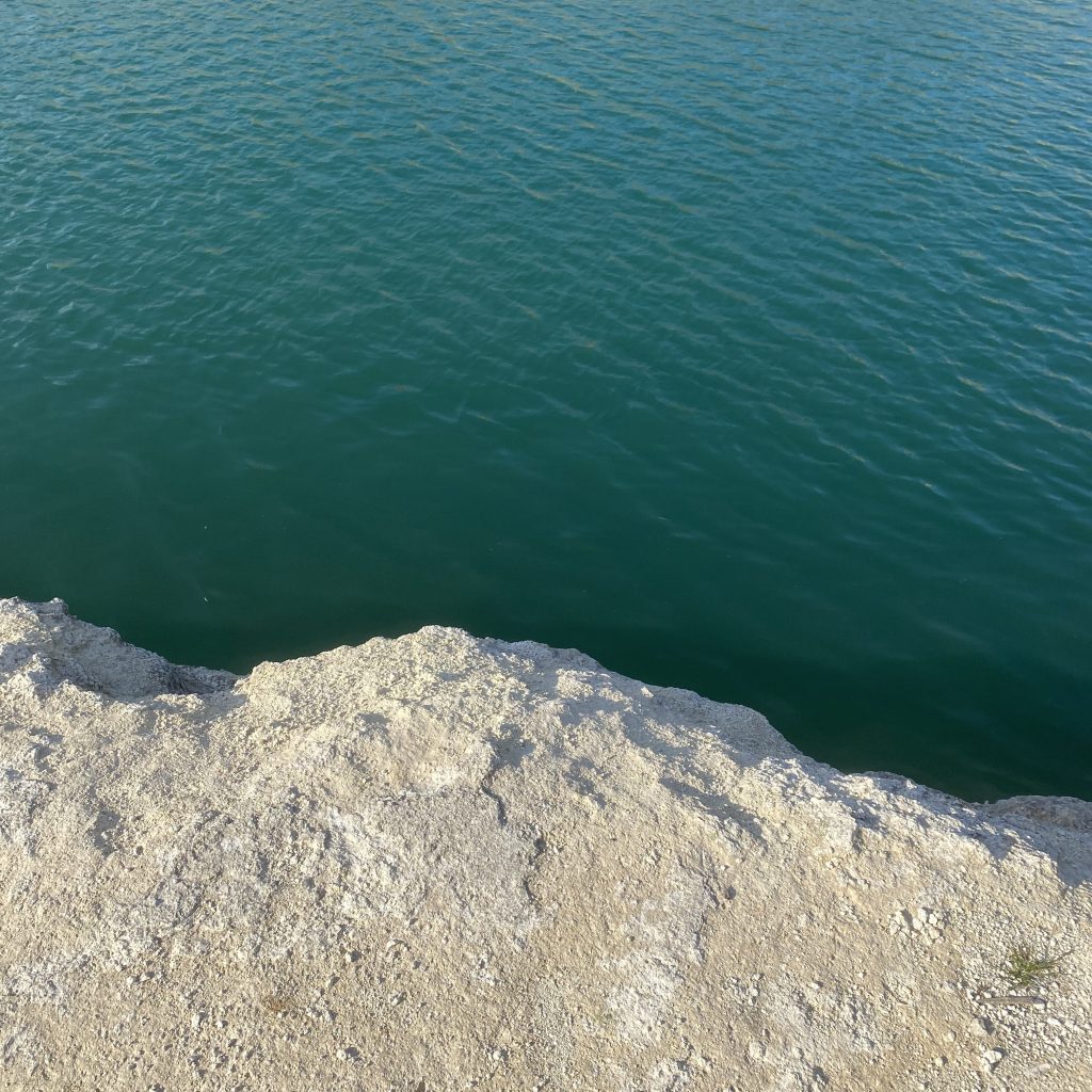 A rocky shoreline meeting deep turquoise water on Fruška Gora. The color of the lake felt almost ocean-like, creating a quiet illusion of being by the sea, far from any coast.