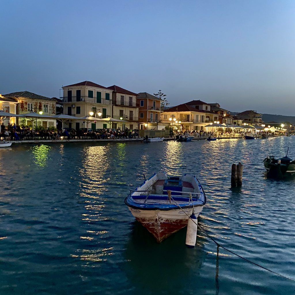 A small boat anchored in the harbor as evening lights flicker across the water. The contrast between the deep blue sea and warm city lights captures the quiet rhythm of coastal life.