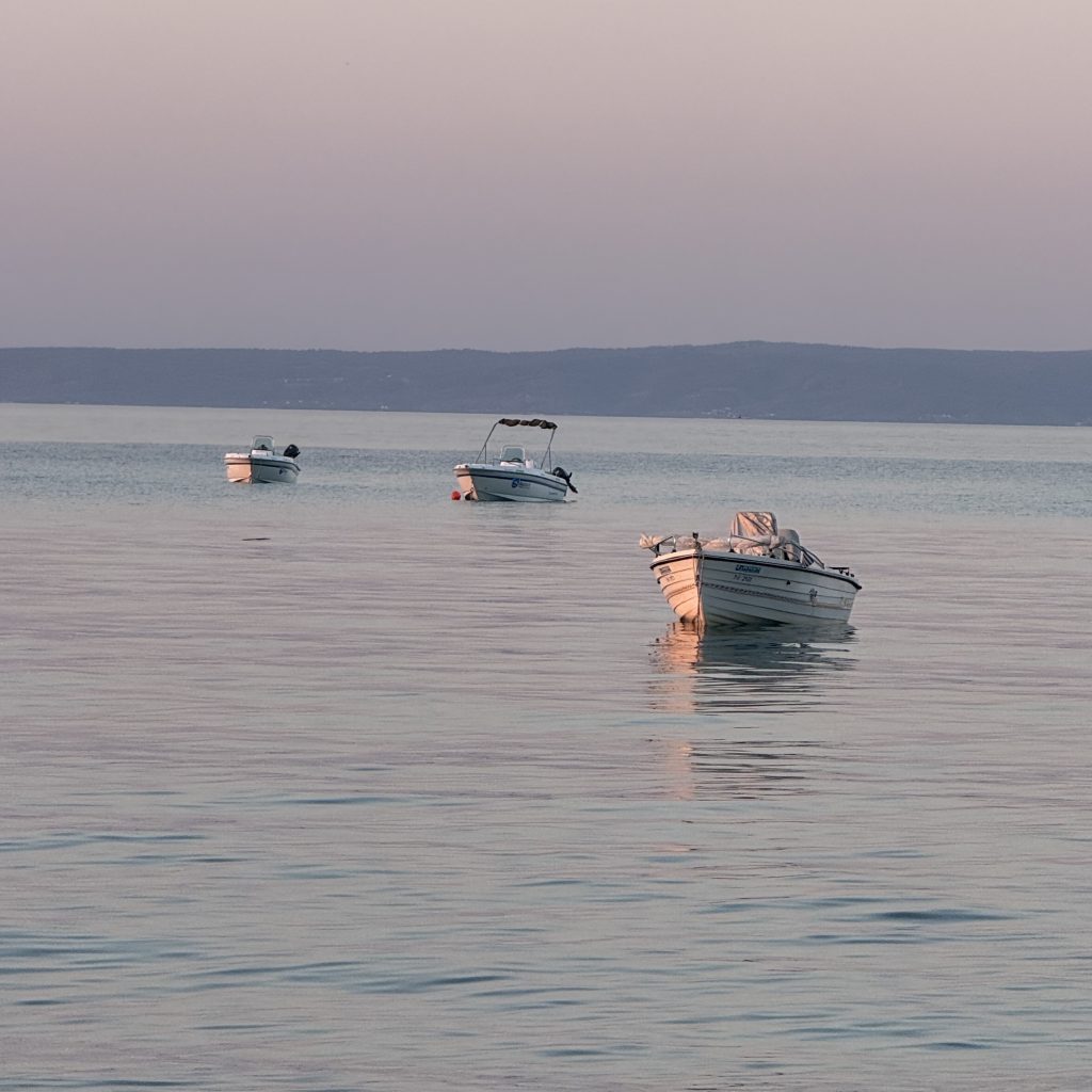Small boats anchored on calm water beneath a soft pastel sky and distant horizon, forming a quiet composition of stillness, balance, and suspended coastal light.