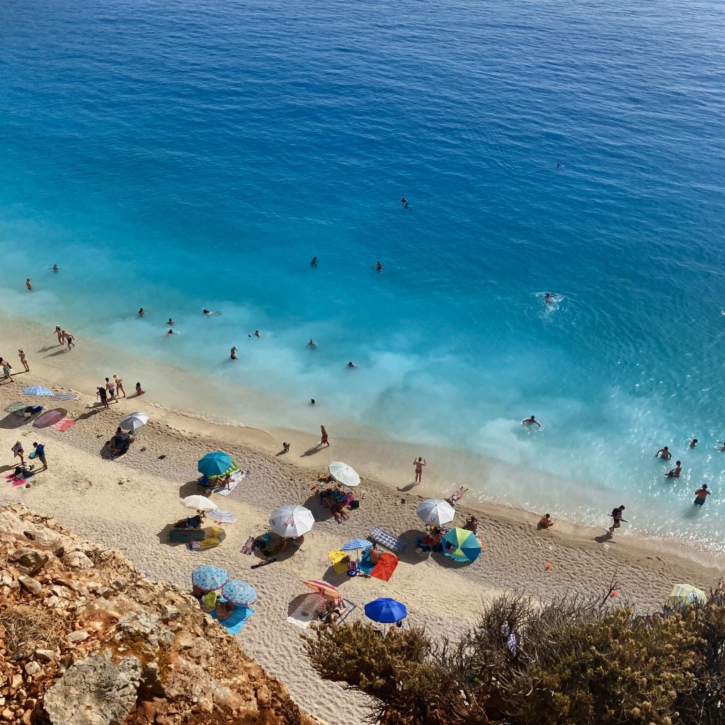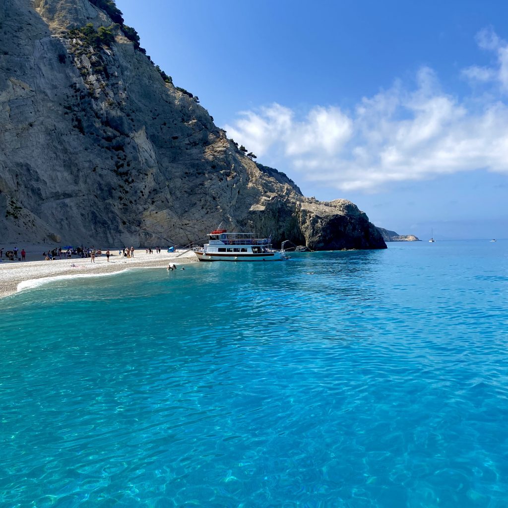 Crystal-clear turquoise water next to steep cliffs and a small beach with people and a boat. The colors felt unreal, almost like a postcard, but it was just one of those perfect summer moments by the sea.
