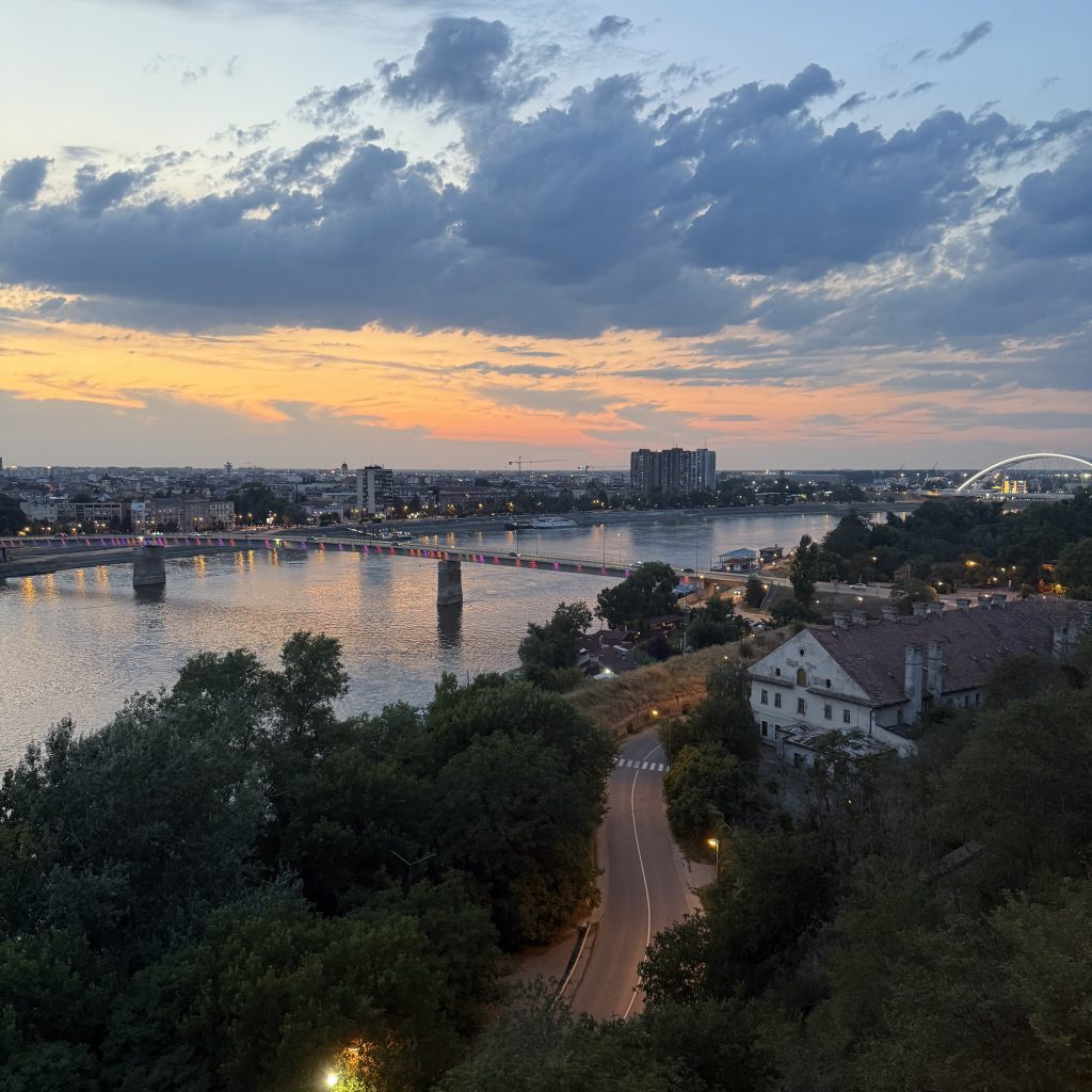 View of Novi Sad from the Petrovaradin Fortress at dusk, with the Danube river, bridges, and city lights slowly turning on. The sky was soft and dramatic, and the city felt calm and wide beneath the clouds.
