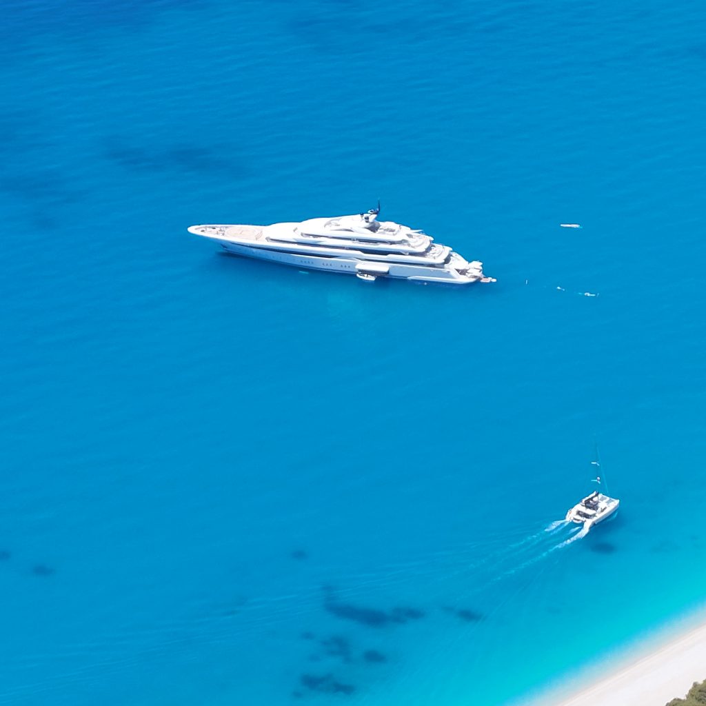 A luxury yacht anchored above the white shore of Egremni Beach, surrounded by deep Ionian blue. The contrast between the pale sand and the saturated sea creates a surreal, almost dreamlike landscape.