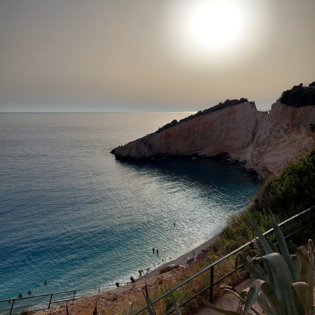 Porto Katsiki during golden hour, with the sun hanging low above the cliffs and the sea reflecting soft light. The beach felt quiet and warm, like the day was slowly folding into evening.