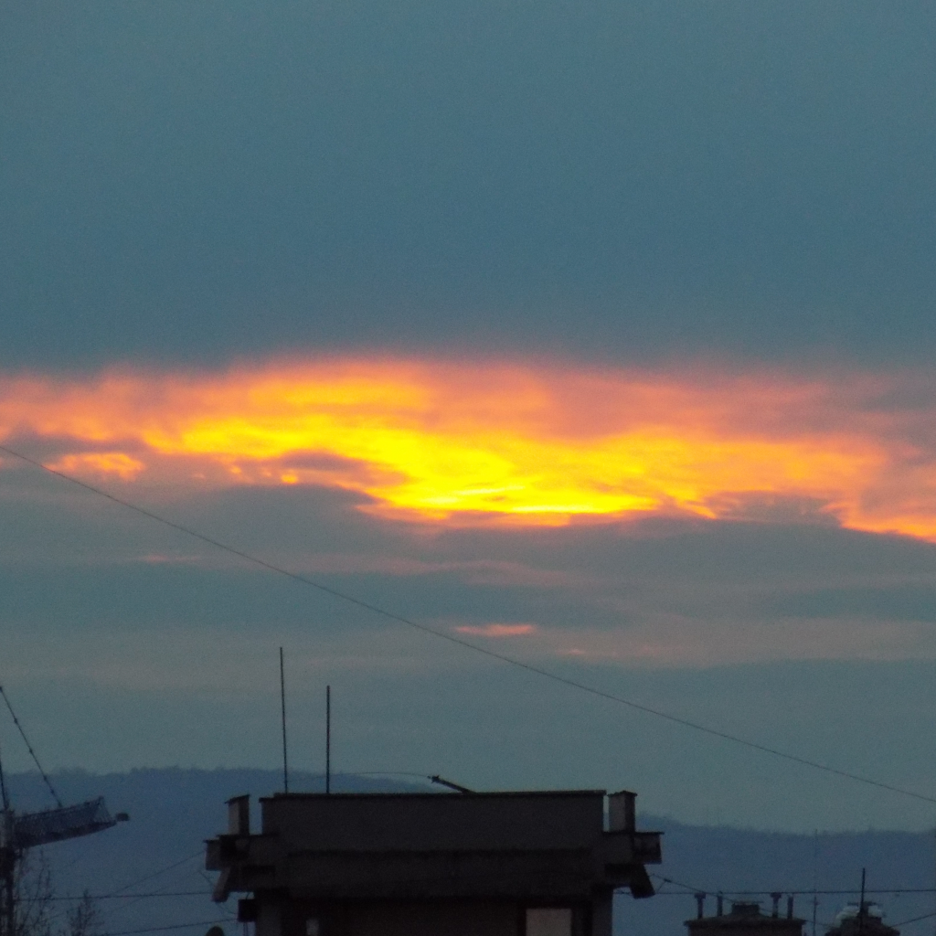 Dark clouds hanging low over the city, with a sudden strip of intense orange and yellow light breaking through. It felt like the sky was burning for a moment, while everything below stayed quiet and still.