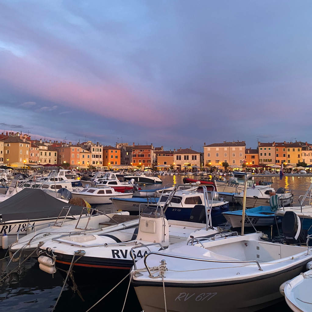 Evening in Rovinj, with small boats resting in the harbor and colorful houses lining the waterfront. The sky was soft and pink, and the whole town felt calm and warm, like one of those moments you wish would last longer.