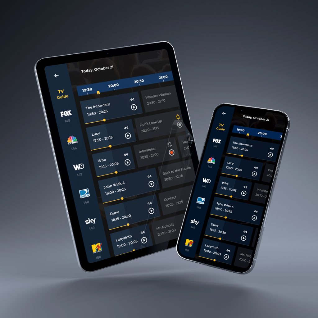 For this project, I designed a TV guide interface focused on helping users quickly navigate past, current, and upcoming programs across multiple channels. The goal was to create a clear visual structure that allows users to instantly understand what is currently airing, what has already passed, and what is coming next. Each program card displays key information such as the title, broadcast time, age rating, and a short description, along with visual indicators for available actions. Depending on the program’s status, users can immediately watch currently available content or set reminders and recordings for upcoming shows. Special attention was given to differences between TV and touch devices. The interface was designed to adapt to both environments.