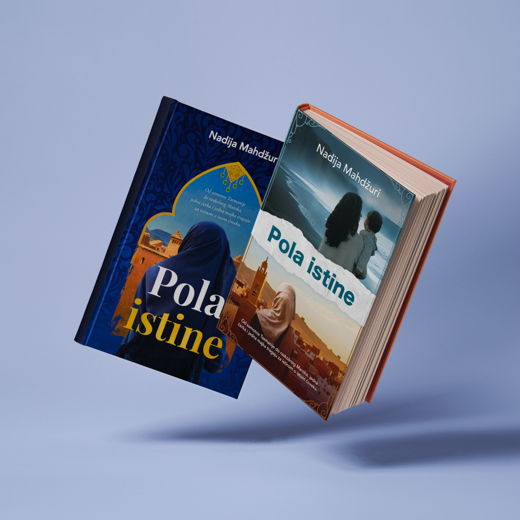 A book cover design showcasing two editions of the novel “Pola istine” by Nadija Mahdžuri, exploring identity, memory, and emotional journeys through warm visual storytelling, cultural motifs, and atmospheric landscapes.