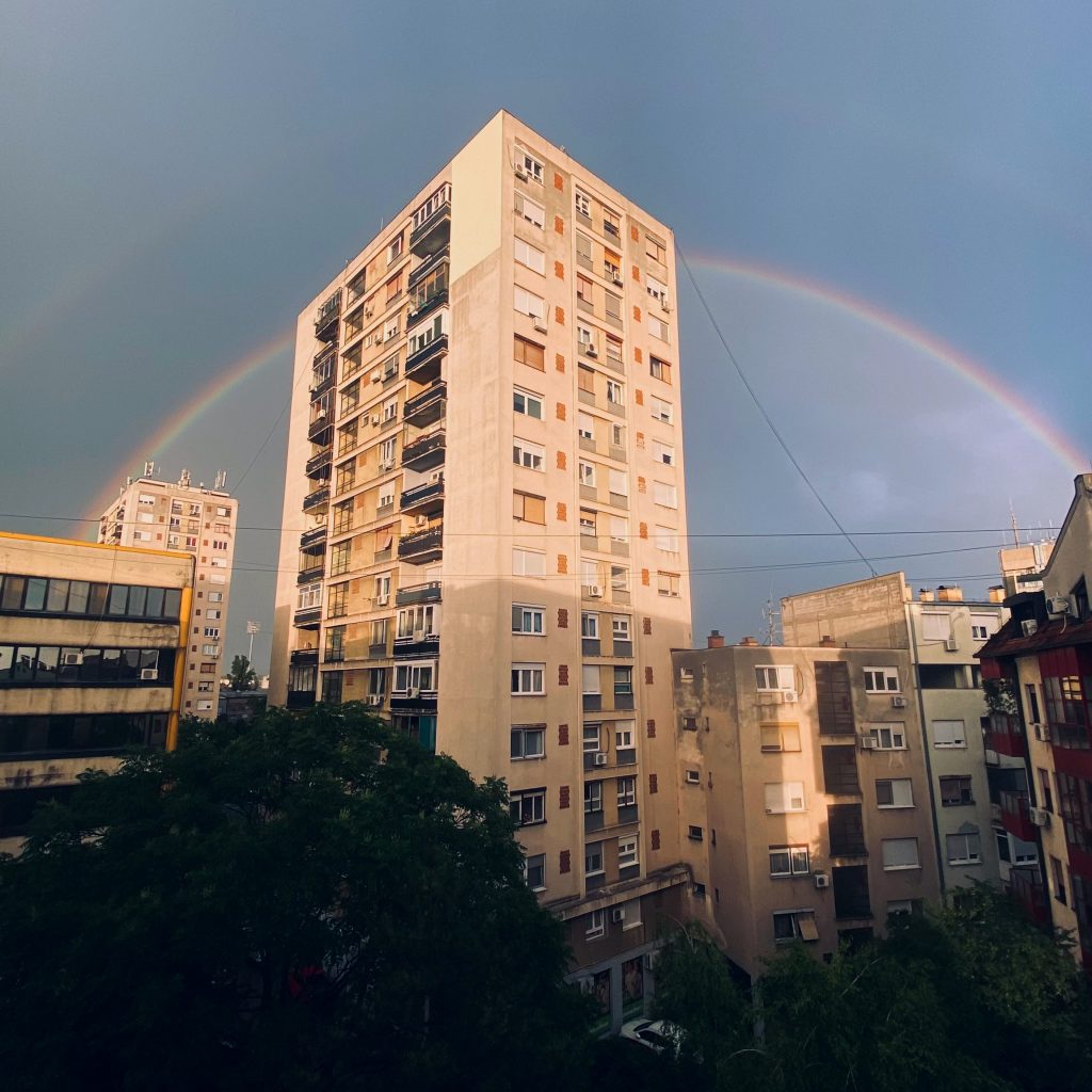 After the storm, the city pauses as concrete softens in warmth, the sky slowly opens, and a fleeting rainbow briefly connects the rooftops in a suspended moment.