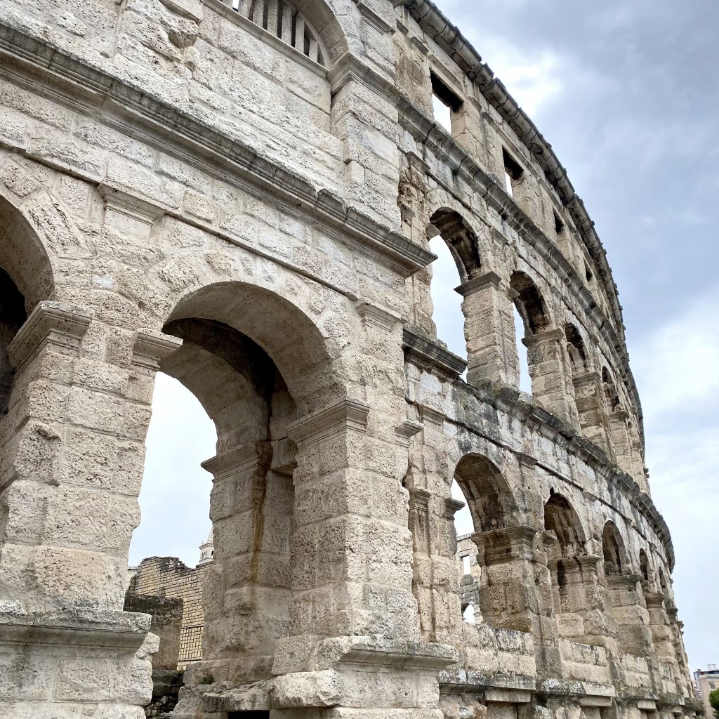 The Roman amphitheater in Pula, where layered stone, repeating arches, and shifting shadows quietly reveal the persistence of history within everyday urban life.
