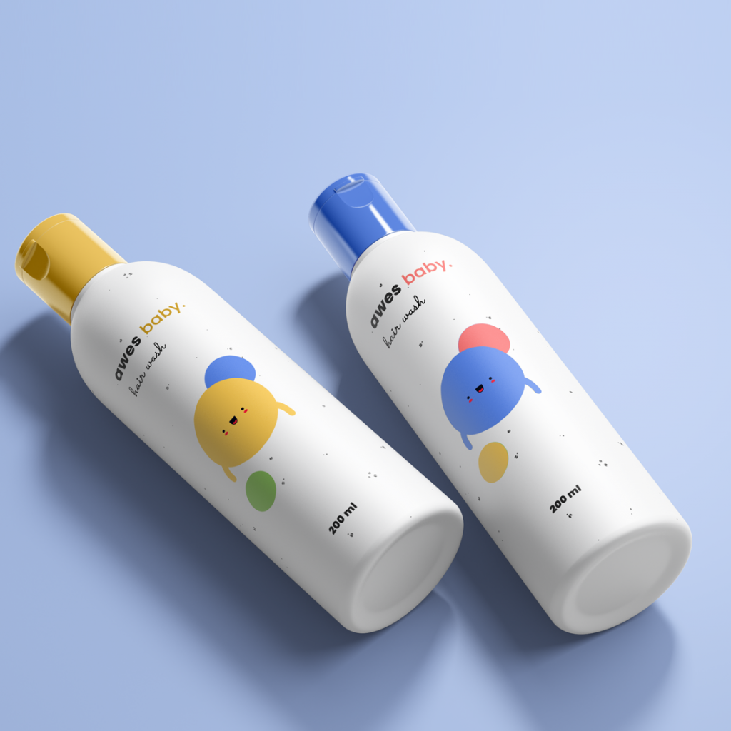 A clean and playful baby cosmetic packaging concept designed to communicate gentleness, safety, and care through soft colors, friendly character illustrations, and a calm, minimal visual language.
