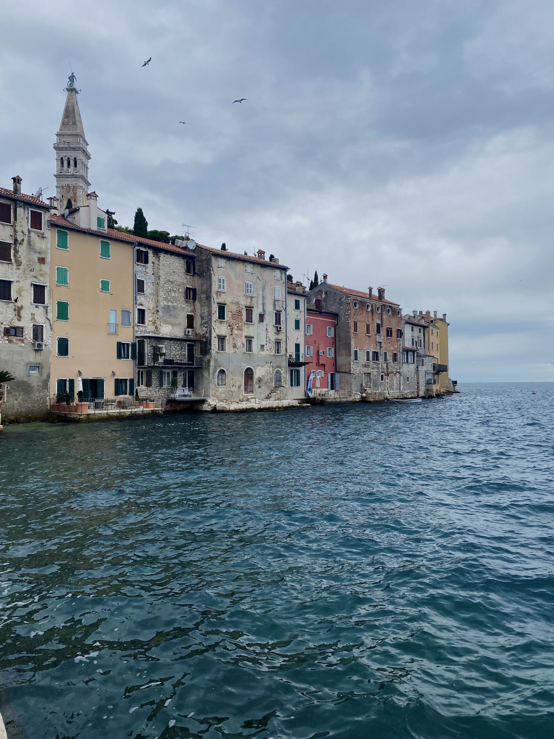 A fragment of Rovinj’s old town, where faded colors and stone walls touch the sea.