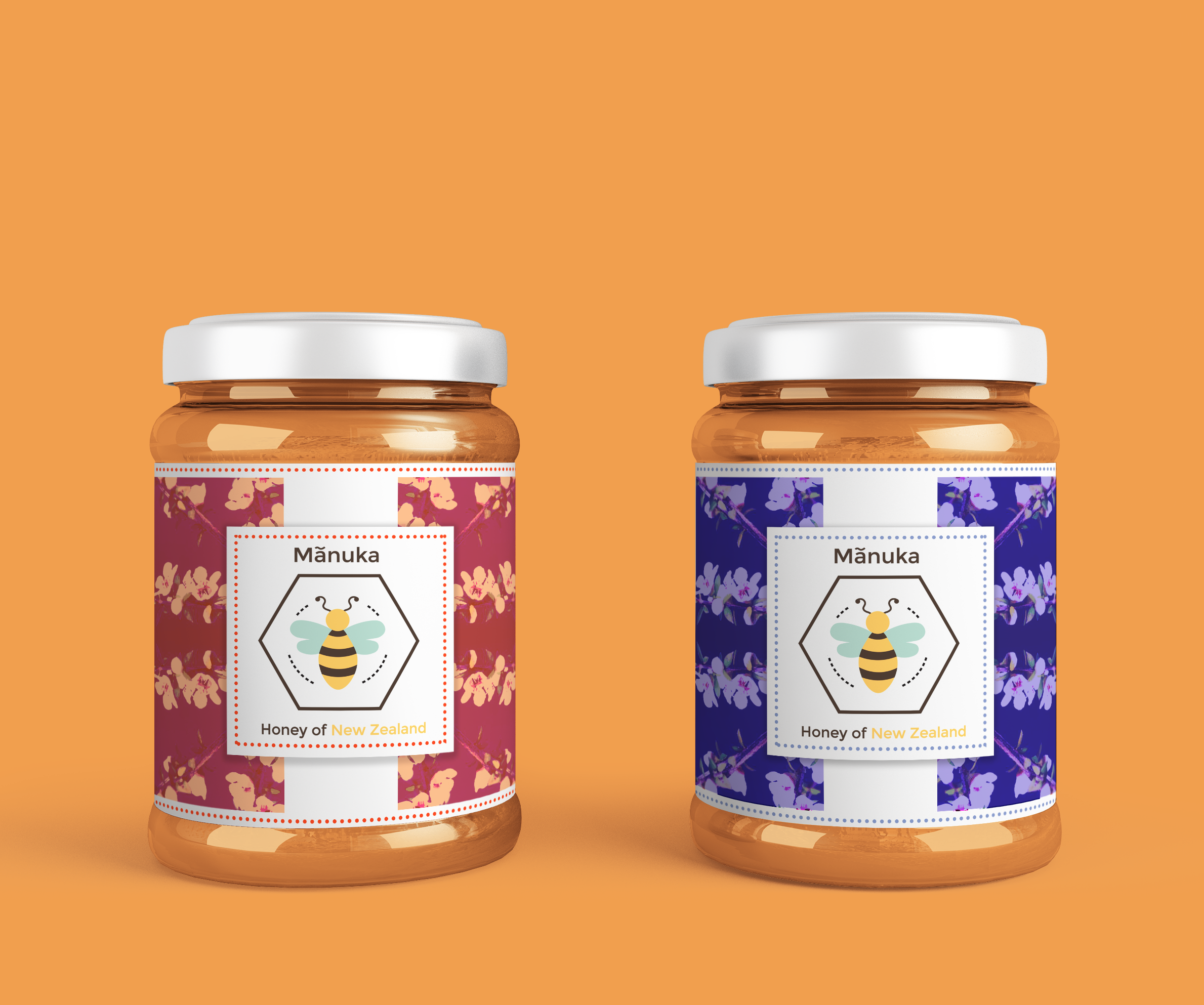 An artisanal Manuka honey label concept using floral motifs and contrasting colorways to communicate authenticity and origin.