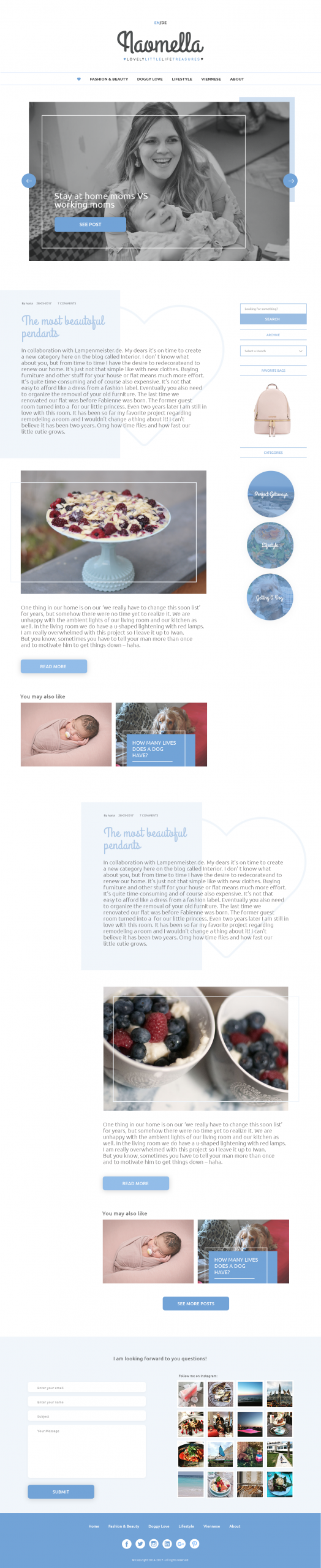The structure supports easy reading and browsing, with clear sections for featured posts, categories, and visual content. I used light tones, subtle decorative elements, and balanced spacing to give the blog a warm, intimate feel while keeping navigation simple and intuitive.