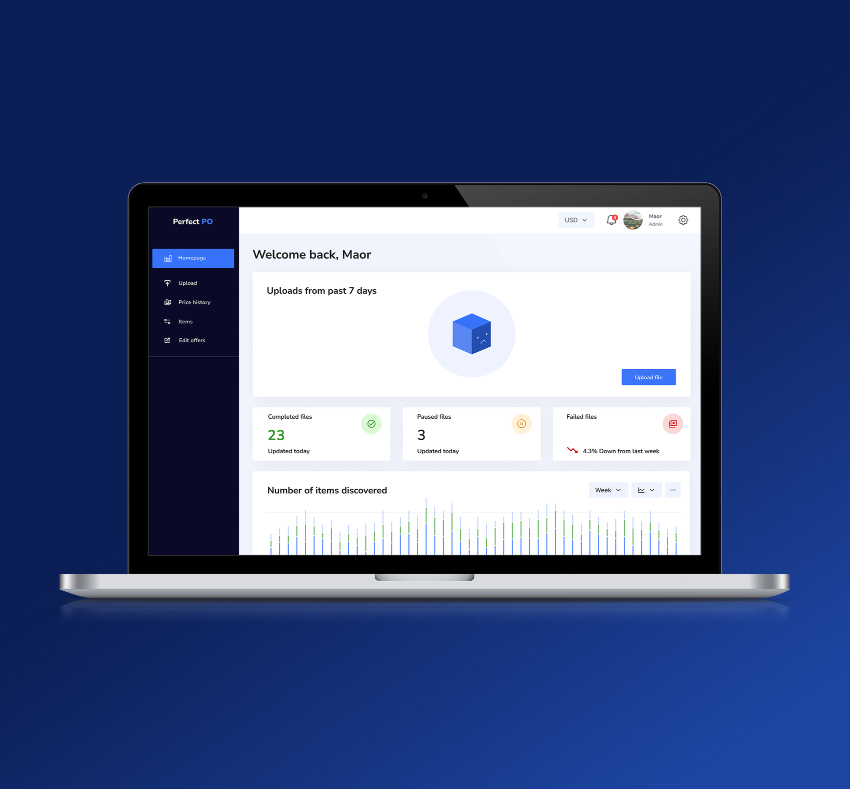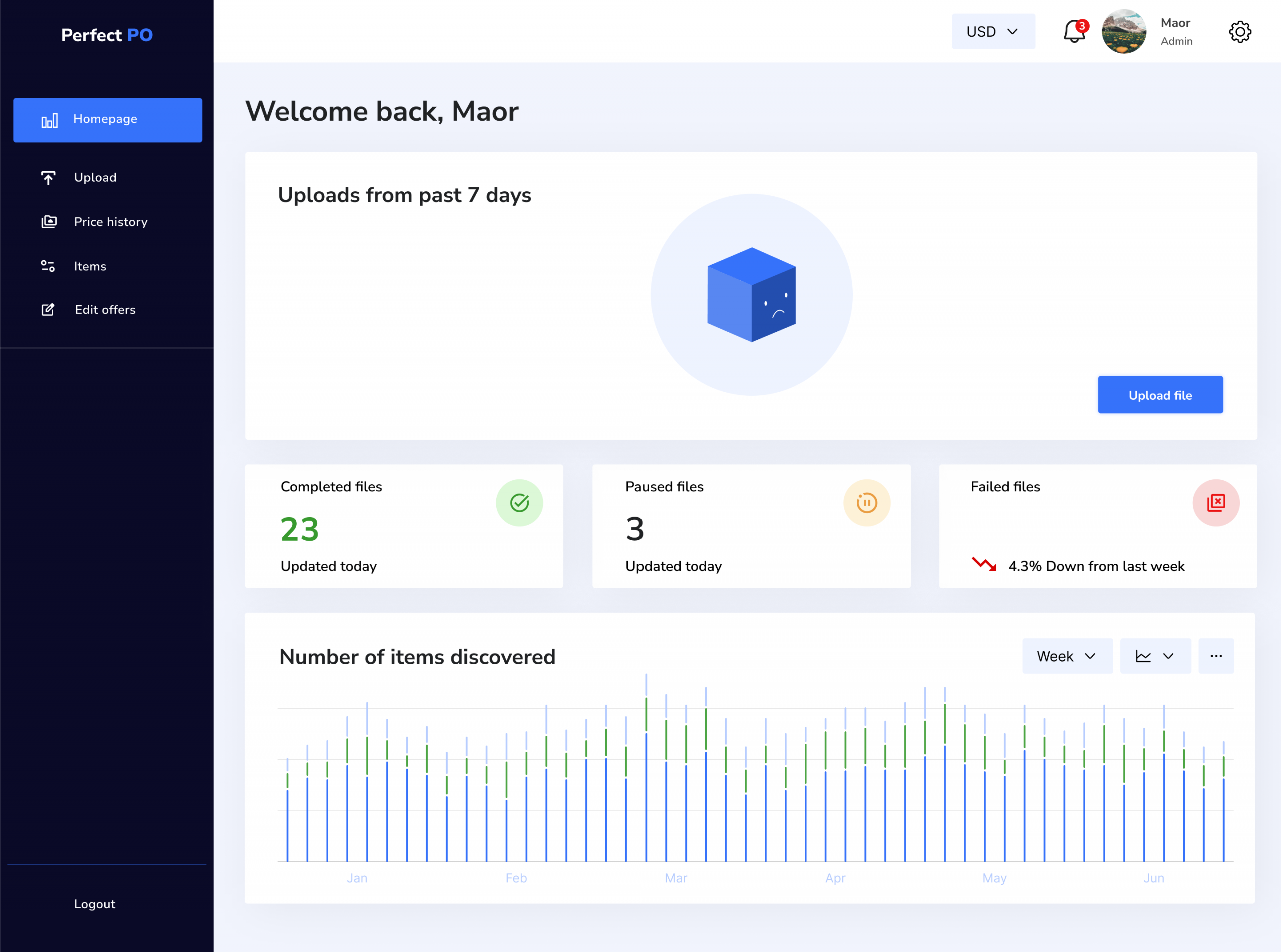 The dashboard highlights key metrics such as processed files, failed uploads, and discovered items, helping users quickly understand their workflow status.