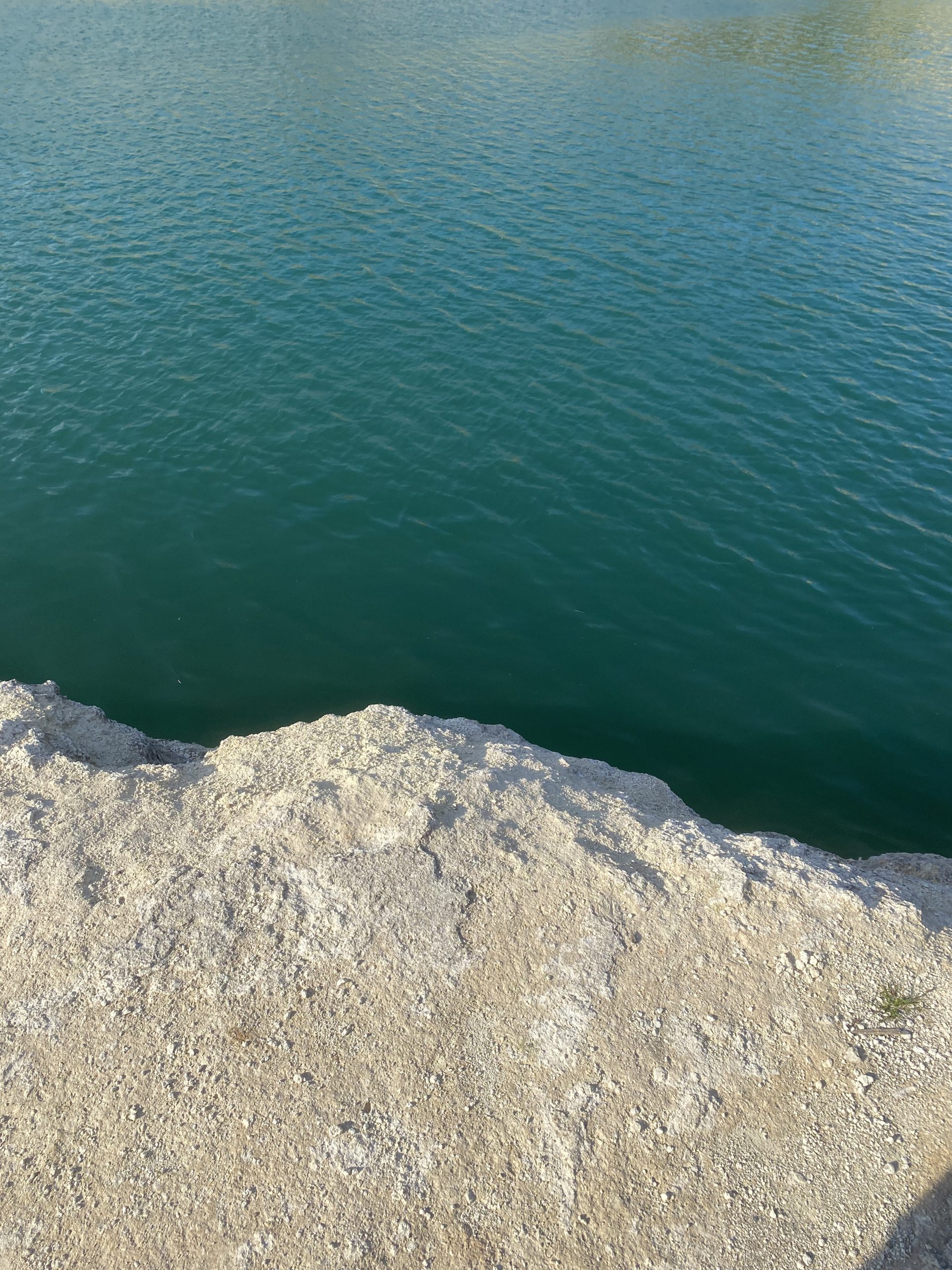 A rocky shoreline meeting deep turquoise water on Fruška Gora. The color of the lake felt almost ocean-like, creating a quiet illusion of being by the sea, far from any coast.